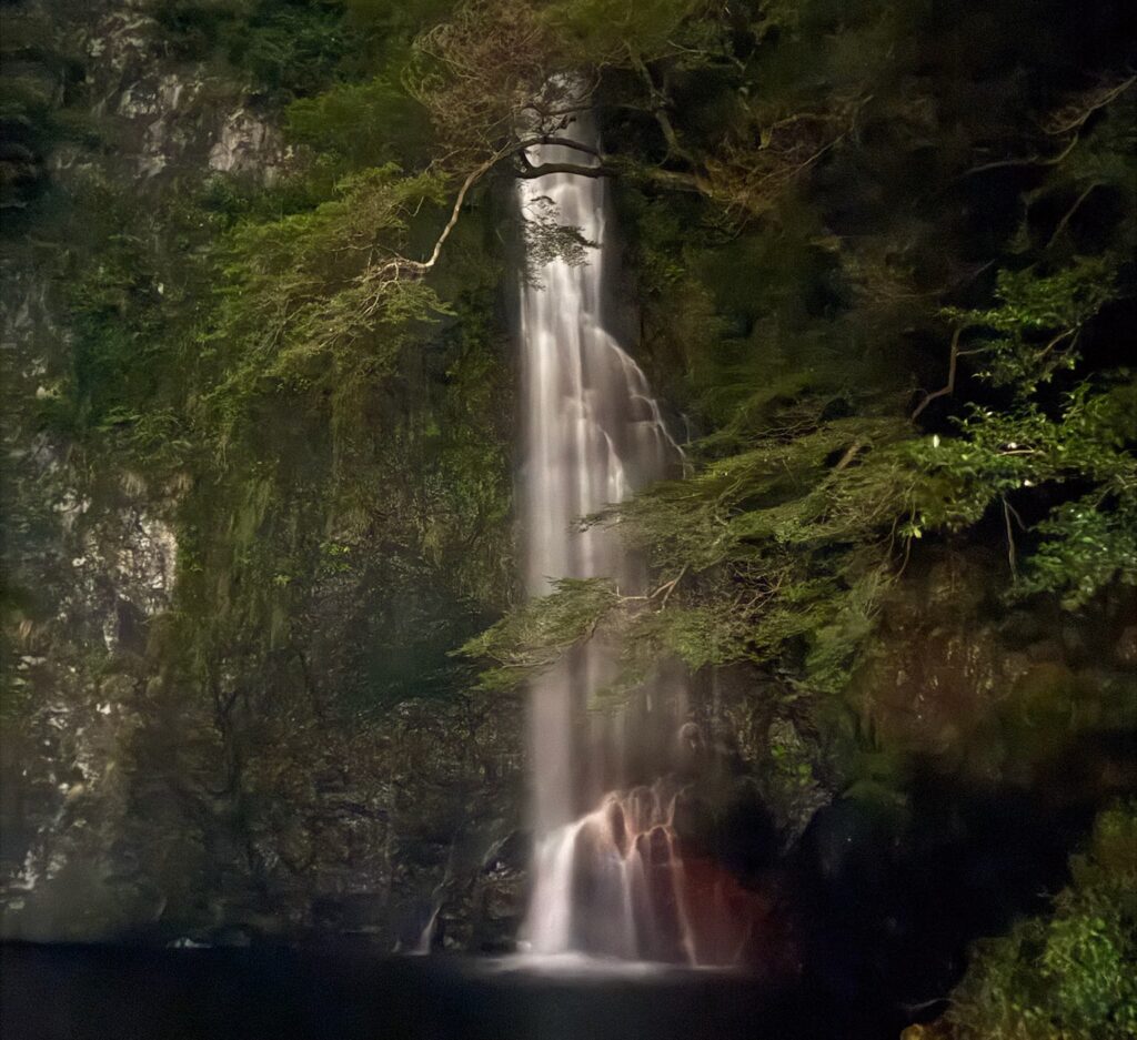 暗闇の中、滝がライトアップされて幻想的に浮かび上がる景色。スマホでもここまで透明感ある写真が撮れます。スローシャッター機能やナイトモードを使えば、初心者でもふんわりと流れる水の表現が楽しめます。